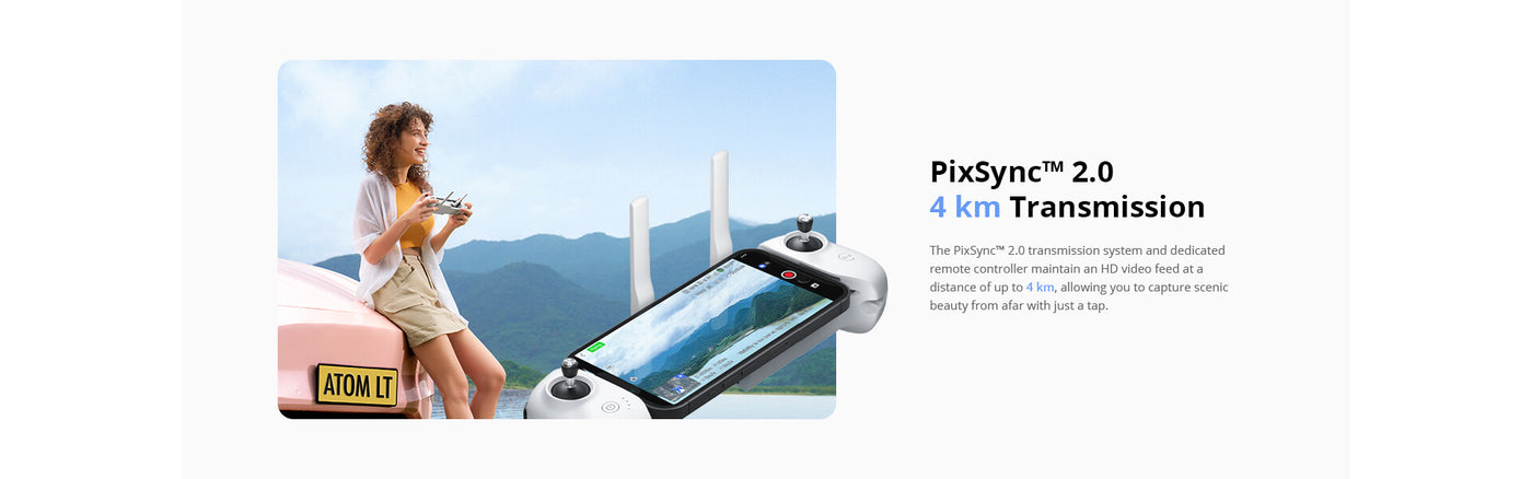 4 km Transmission Range: The PixSync 2.0 transmission system and dedicated remote controller maintain an HD video feed at a distance of up to 4 km, allowing you to capture scenic beauty in the distance with just a tap.