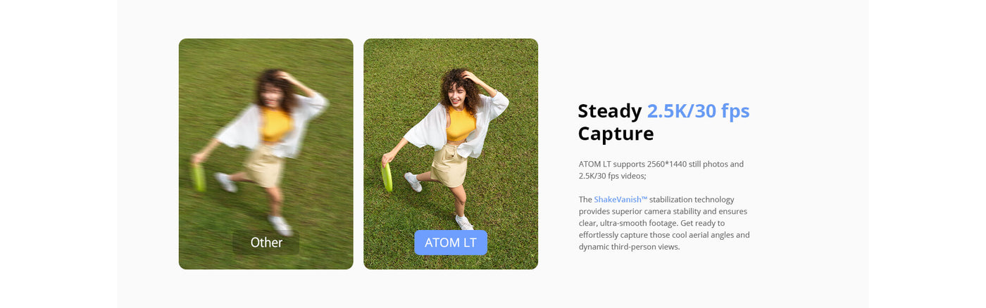 Steady 2.5K Capture: ATOM LT supports 12MP aerial photos and 2.5K videos. The ShakeVanish stabilization technology provides superior camera stability and ensures clear, ultra-smooth footage. Get ready to effortlessly capture those cool aerial angles and dynamic third-person views.